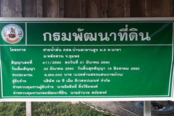 วันอังคารที่ 5 กันยายน 2560 เวลา 15.30 น. นายถวิล มั่งนุ้ย ผู้อำนวยการสำนักงานพัฒนาที่ดินเขต 11 พร้อมด้วยนายจำเริญ นาคคง ผู้อำนวยการสถานีพัฒนาที่ดินชุมพร นายวิโรจน์ ชูช่วย เจ้าพนักงานการเกษตรอาวุโส และน.ส.ณัฐรดา ภานุมาศ นักวิชาการเกษตรปฏิบัติการ ลงพื้นที่ตรวจรับงานงวดสุดท้าย งานพัฒนาแหล่งน้ำเพื่อการอนุรักษ์ดินและน้ำ ปีงบประมาณ 2560 โครงการฝายน้ำล้น คสล.บ้านสะพานสูง หมู่ 8 ตำบลนาขา อำเภอหลังสวน จังหวัดชุมพร