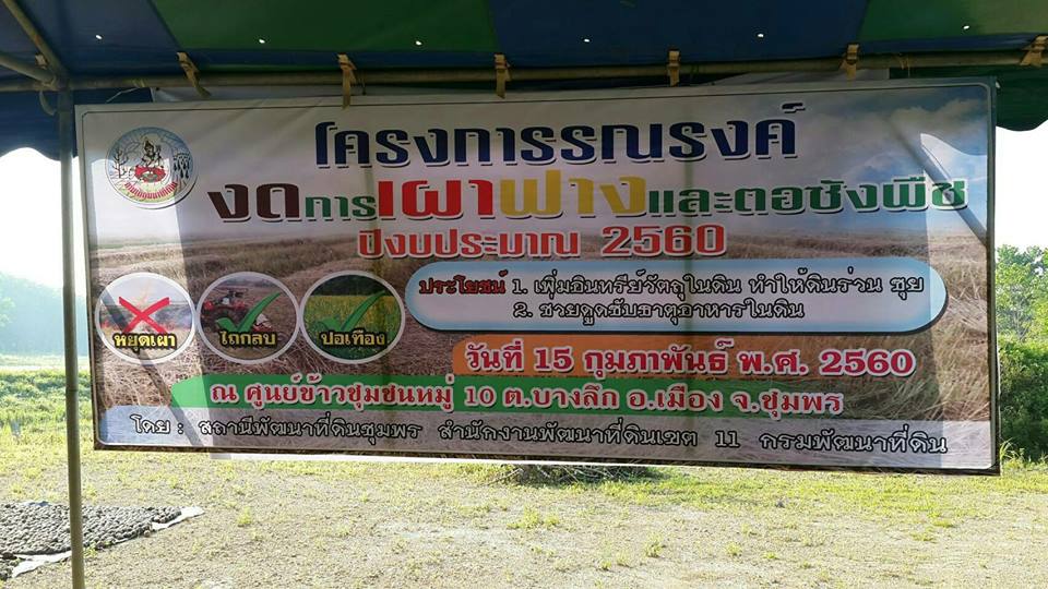 วันที่ 15 กุมภาพันธ์ 2560 สถานีพัฒนาที่ดินชุมพร นำโดย นายจำเริญ นาคคง ผู้อำนวยการสถานีพัฒนาที่ดินชุมพร พร้อมด้วยนายณัฐพร สิทธิวัฒน์ นักวิชาการเกษตรชำนาญการ และเจ้าหน้าที่จัดงานรณรงค์งดเผาฟางและตอซังพืช(นาข้าว) ณ หมู่ที่10 ตำบลบางลึก อำเภอเมือง หวัดชุมพร โดยมีนายอำเภอนักรบ ณ ถลาง ให้เกียรติมาเป็นประธานเปิดโครงการฯ มีผู้นำท้องถิ่น หมอดินอาสาเกษตรกรและผู้มีเกียรติร่วมงานประมาณ 100 คน