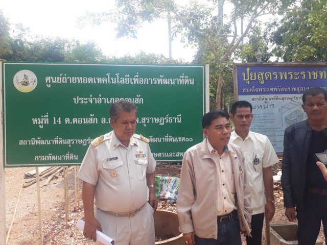 วันจันทร์ที่ 5 กุมภาพันธ์ 2561 เวลา 13.00น. นายถวิล มั่งนุ้ย ผู้อำนวยการสำนักงานพัฒนาที่ดินเขต 11 รักษาการในตำแหน่งผู้อำนวยการสถานีพัฒนาที่ดินสุราษฎร์ธานี นายธาร นวลนึก เกษตรจังหวัดสุราษฏร์ธานีพร้อมด้วย คณะทำงานในพื้นที่สำนักงานพัฒนาที่ดินเขต 11 เข้าเยี่ยมเยียนศูนย์ถ่ายทอดเทคโนโลยีประจำตำบลดอนสักและให้คำแนะนำการพัฒนาที่ดิน ตามศาสตร์พระราชาสู่การพัฒนาที่ดินที่ยั่งยืนของนายสมชาติ ปานนาคินทร์ (หมอดินอาสา)โดยมีนายสุรเชนทร์ แพเพชรทอง นักวิชาการเกษตรชำนาญการ ร่วมต้อนรับและนำเสนอการดำเนินงานของศูนย์ฯ (ต่อยอด ปี 61) ณ บ้านนางกำใหม่ หมู่ที่ 14 ตำบลดอนสัก อำเภอดอนสัก จังหวัดสุราษฏร์ธานี