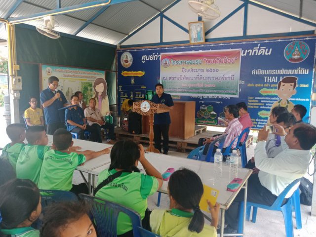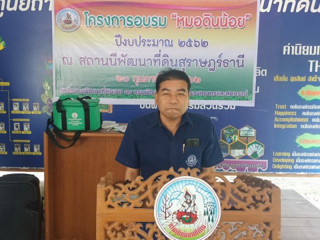วันพุธที่ 20 กุมภาพันธ์ 2562 เวลา 13.00 น. นายถวิล มั่งนุ้ย ผู้อำนวยการสำนักงานพัฒนาที่ดินเขต 11 เป็นประธานเปิดโครงการอบรม “หมอดินน้อย” ของกรมพัฒนาที่ดิน ปีงบประมาณ 2562 ดำเนินโครงการฯโดยสถานีพัฒนาที่ดินสุราษฎร์ธานี สำนักงานพัฒนาที่ดินเขต 11 ซึ่งมีนายมงคล ทองจิบ ผู้อำนวยการสถานีพัฒนาที่ดินสุราษฎร์ธานี ให้การต้อนรับ พร้อมกล่าวรายงานถึงวัตถุประสงค์การดำเนินโครงการฯในครั้งนี้ โดยมีคณะครู นักเรียน โรงเรียนวัดบ้านยูงทอง โรงเรียนบ้านสามสัก โรงเรียนบ้านหนองเรียน โรงเรียนบ้านท่าเพชร และโรงเรียนวัดประสิทธาราม จำนวน 75 ราย เข้าร่วมการอบรม ณ สถานีพัฒนาที่ดินสุราษฎร์ธานี ตำบลท่าอุเท อำเภอกาญจนดิษฐ์ จังหวัดสุราษฎร์ธานี