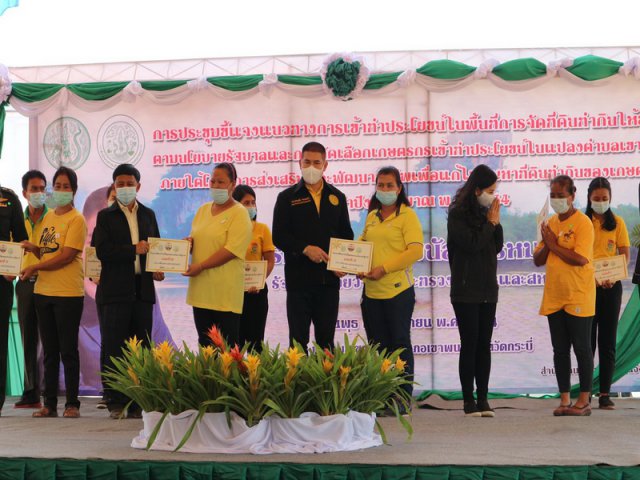วันพุธที่ 7 เมษายน 2564 เวลา 12.00น. นายภิญโญ สุวรรณชนะ ผู้อำนวยการสำนักงานพัฒนาที่ดินเขต 11 นายประสิทธิ์ แสงภักดี ผู้อำนวยการสถานีพัฒนาที่ดินกระบี่ และหัวหน้าส่วนราชการในพื้นที่ที่เกี่ยวข้อง ร่วมต้อนรับ ร้อยเอกธรรมนัส พรหมเผ่า รัฐมนตรีช่วยว่าการกระทรวงเกษตรและสหกรณ์ และคณะฯ ลงพื้นที่ตรวจราชการ การดำเนินโครงการจัดที่ดินทำกินให้ชุมชนตามนโยบายรัฐบาล หมู่ที่3 ตำบลเขาพนม อำเภอเขาพนม จังหวัดกระบี่ โดยมีนายอนุวรรตน์ โหมดพริ้ง รองผู้ว่าราชการจังหวัดกระบี่ กล่าวต้อนรับ โดย รมช.กษ. ให้เกียรติเป็นประธานจัดผู้ได้รับการจัดสรรที่ดินทำกินลงตำแหน่งแปลงที่ดิน และมอบเมล็ดพันธ์ุปอเทือง เพื่อให้แก่เกษตรกรที่ได้รับการจัดสรรที่ดิน นำไปปรับปรุงบำรุงดิน จำนวน 72 ราย พร้อมกล่าวให้โอวาทและมอบนโยบายเกี่ยวกับแนวทางการใช้ประโยชน์ที่ดินทำกินในเขตปฏิรูปที่ดิน