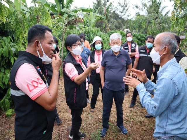 วันพฤหัสบดีที่ 23 มิถุนายน พ.ศ. 2565 เวลา 16.00น. นางสาวเบญจพร ชาครานนท์ อธิบดีกรมพัฒนาที่ดิน นายชัยวัฒน์ สิทธิบุศย์ ที่ปรึกษากรมพัฒนาที่ดิน พร้อมด้วยนายภิญโญ สุวรรณชนะ ผู้อำนวยการสำนักงานพัฒนาที่ดินเขต 11 ข้าราชการและเจ้าหน้าที่ที่เกี่ยวข้อง ร่วมติดตาม อธพ.พด. ลงพื้นที่ตรวจราชการจังหวัดชุมพร โดยมีนายวิเชียร พรหมทอง ผู้อำนวยการสถานีพัฒนาที่ดินชุมพร ข้าราชการและเจ้าหน้าที่สถานีพัฒนาที่ดินชุมพร หมอดินอาสา ในพื้นที่ ร่วมต้อนรับ อธพ.พด ตรวจเยี่ยมการจัดการสวนสละแบบผสมผสาน (IPM) สวนนิลเขียว ของนายบำรุง นิลเขียว หมู่ 11 ตำบลบ้านนา อำเภอเมือง จังหวัดชุมพร ซึ่งมีแนวทางการจัดการสวน คือมีการจัดการดินตามฐานข้อมูลชุดดินอ่าวลึก ที่ได้จากกรมพัฒนาที่ดิน เป็นข้อมูลพื้นฐานในการเพาะปลูกต้นสละ โดยมีการใส่ปุ๋ยเคมีตามค่าวิเคราะห์ดินร่วมกับปุ๋ยอินทรีย์ (มูลวัวนมอัตรา 10 กระสอบต่อต้นต่อปี) มีการปรับสภาพดินก่อนการปลูกต้นสละด้วยปุ๋ยอินทรีย์ และวัสดุปูนและมีการใช้ปูนขาวโรยโคนต้นสละทุกปีเพื่อยกระดับ pH และลดการระบาดของเชื้อรา มีการเพิ่มอินทรีย์วัตถุในดินโดยนำกิ่งสละที่มีการตัดแต่งกิ่ง มาย่อยด้วยเครื่องย่อยกิ่งไม้ และใช้คลุมดินเพื่อรักษาความชื้นในดิน ในลักษณะ Zero Waste ไม่มีการเผาขยะกิ่งไม้ในพื้นที่ มีการรักษาคุณภาพผลลิตโดยมีเทคนิคการตัดแต่งลูก ไม่ให้ดกจนเกิน เพื่อเพิ่มคุณภาพผลผลิต ร่วมกับการเก็บเกี่ยวในช่วงระยะเวลาที่เหมาะสม 8 เดือน โอกาสนี้ อธพ.พด. และคณะฯ ได้เยี่ยมชมสวนกาแฟ พันธุ์โรบัสต้า ของนายบำรุง นิลเขียว อีกด้วย