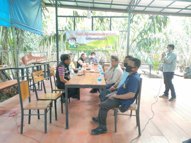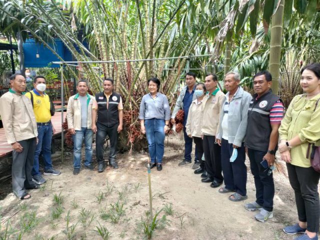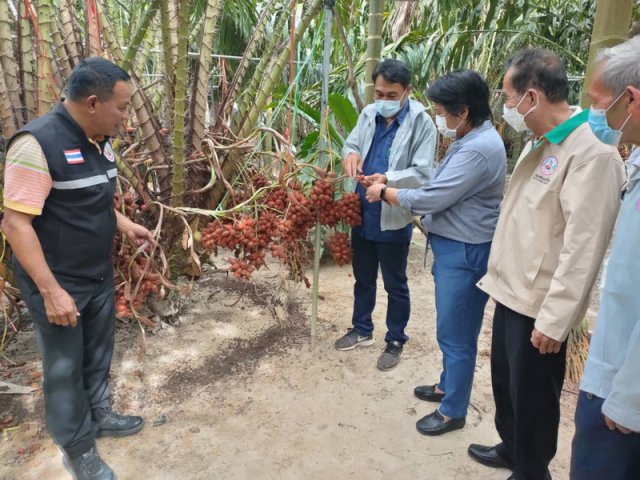 จากนั้น เวลา 14:30 น. รองอธิบดีกรมพัฒนาที่ดิน และคณะ ลงพื้นที่เยี่ยมชมสวนสละธานินทร์ ของนายธานินทร์ ใจห้าว หมอดินอาสาประจำหมู่บ้าน หมู่ที่ 14 ต.เสาเภา อ.สิชล จ.นครศรีธรรมราช ซึ่งมีการใช้ พด.14 ไตรโคเดอร์มาควบคุมและกำจัดโรคในแปลงปลูกสละและแปลงปลูกทุเรียน โดยในพื้นที่ช่วงที่สภาพอากาศมีความชื้นสูงแปลงสละมีเชื้อราสาเหตุของโรคขึ้นบริเวณลูกสละ และในแปลงปลูกทุเรียนเกิดโรครากเน่าโคนเน่าจากเชื้อราไฟทอปธอรา พาล์มิโวรา (Phytophthora palmivora) จากการใช้ พด.14 สามารถรักษาและควบคุมเชื้อราที่เกิดขึ้นได้ทั้ง 2 แปลง โดยมีหมอดินอาสาในพื้นที่ร่วมให้การต้อนรับด้วย