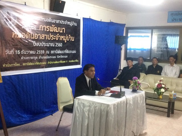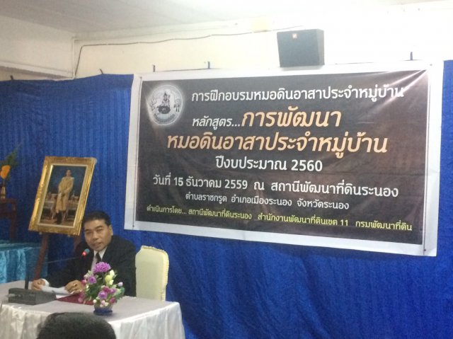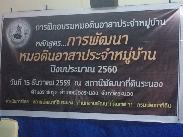วันพฤหัสบดีที่ 15 ธันวาคม 2559 เวลา 10.00 น. นายถวิล มั่งนุ้ย ผู้อำนวยการสำนักงานพัฒนาที่ดิน 11 เป็นประธานเปิดโครงการฝึกอบรม หลักสูตร "การพัฒนาหมอดินอาสาประจำหมู่บ้าน " ประจำปีงบประมาณ 2560 จำนวน 178 คน เพื่อให้หมอดินอาสาประจำหมู่บ้าน ทราบถึงบทบาทหน้าที่ของหมอดินอาสา มีความรู้ เรื่องแนวทางเกษตรอินทรีย์และการรับรองมาตรฐานเกษตรอินทรีย์แบบมีส่วนร่วม พี จี เอส และเพิ่มเติมองค์ความรู้ด้านการข่าว พร้อมด้วยเจ้าหน้าที่ สพด.ระนอง และหน่วยงานที่เกี่ยวข้อง ณ สถานีพัฒนาที่ดินระนอง ตำบลราชกรูด อำเภอเมืองระนอง จังหวัดระนอง