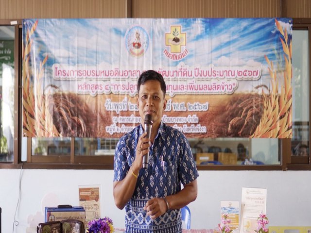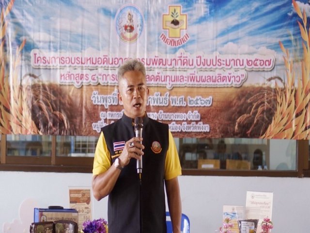 วันพุธที่ 21 กุมภาพันธ์ 2567 เวลา09.00น. สถานีพัฒนาที่ดินพังงา จัดโครงการอบรมหมอดินอาสา หลักสูตรที่ 4 "การปลูกข้าว ลดต้นทุนและเพิ่มผลผลิตข้าว" ประจำปีงบประมาณ 2567 โดยมีนายนรา สุขไชย ผู้อำนวยการสำนักงานพัฒนาที่ดินเขต 11 เป็นประธานเปิดการอบรมฯ และนายปัญญา ใจสมุทร ผู้อำนวยการสถานีพัฒนาที่ดินพังงา กล่าวรายงานถึงวัตถุประสงค์การจัดอบรมฯ เพื่อมุ่งหวังให้หมอดินอาสาได้เรียนรู้เทคโนโลยีในการพัฒนาที่ดินสำหรับการผลิตข้าวที่เหมาะสมกับสภาพตามบริทบของท้องถิ่นของจังหวัดพังงา โดยมีหมอดินอาสาเข้าร่วมอบรมจำนวน 66 ราย ณ สหกรณ์กองทุนสวนยาง บ้านบางทอง จำกัด หมู่ที่ 2 ตำบลบางทอง อำเภอท้ายเหมือง จังหวัดพังงา