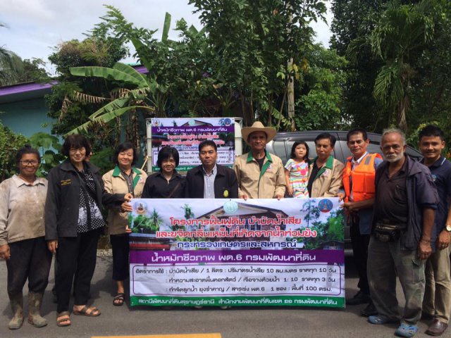 วันพุธที่ 18 มกราคม 2560 เวลา 10.30 น. นายถวิล มั่งนุ้ย ผู้อำนวยการสำนักงานพัฒนาที่ดินเขต 11 พร้อมด้วย นายสุรเชนทร์ แพเพชรทอง นักวิชาการเกษตรชำนาญการ สถานีพัฒนาที่ดินสุราษฎร์ธานี และเจ้าหน้าที่ ลงพื้นที่ ตรวจเยี่ยมกลุ่มเกษตรกรชุมชนบ้านบางใหญ่ เยี่ยมหมอดินอาสา และบำบัดน้ำเสียและขจัดกลิ่นที่เกิดจากน้ำท่วมขัง ด้วย(น้ำหมักชีวภาพ พด.6) เพื่อฟื้นฟูพื้นที่ที่ประสบปัญหาน้ำท่วมขังหลังจากเกิดอุทกภัยในพื้นที่ ม.6 ต.มะขามเตี้ย อ.เมือง จ.สุราษฎร์ธานี พร้อมได้ประสานไปยัง นายธาร นวลนึก ผอ.ศูนย์ส่งเสริมเทคโนโลยีการเกษตรด้านอารักขาพืช จังหวัดสุราษฎร์ธานี เนื่องจากเกษตรกรประสบปัญหาด้วงกินยอดมะพร้าว