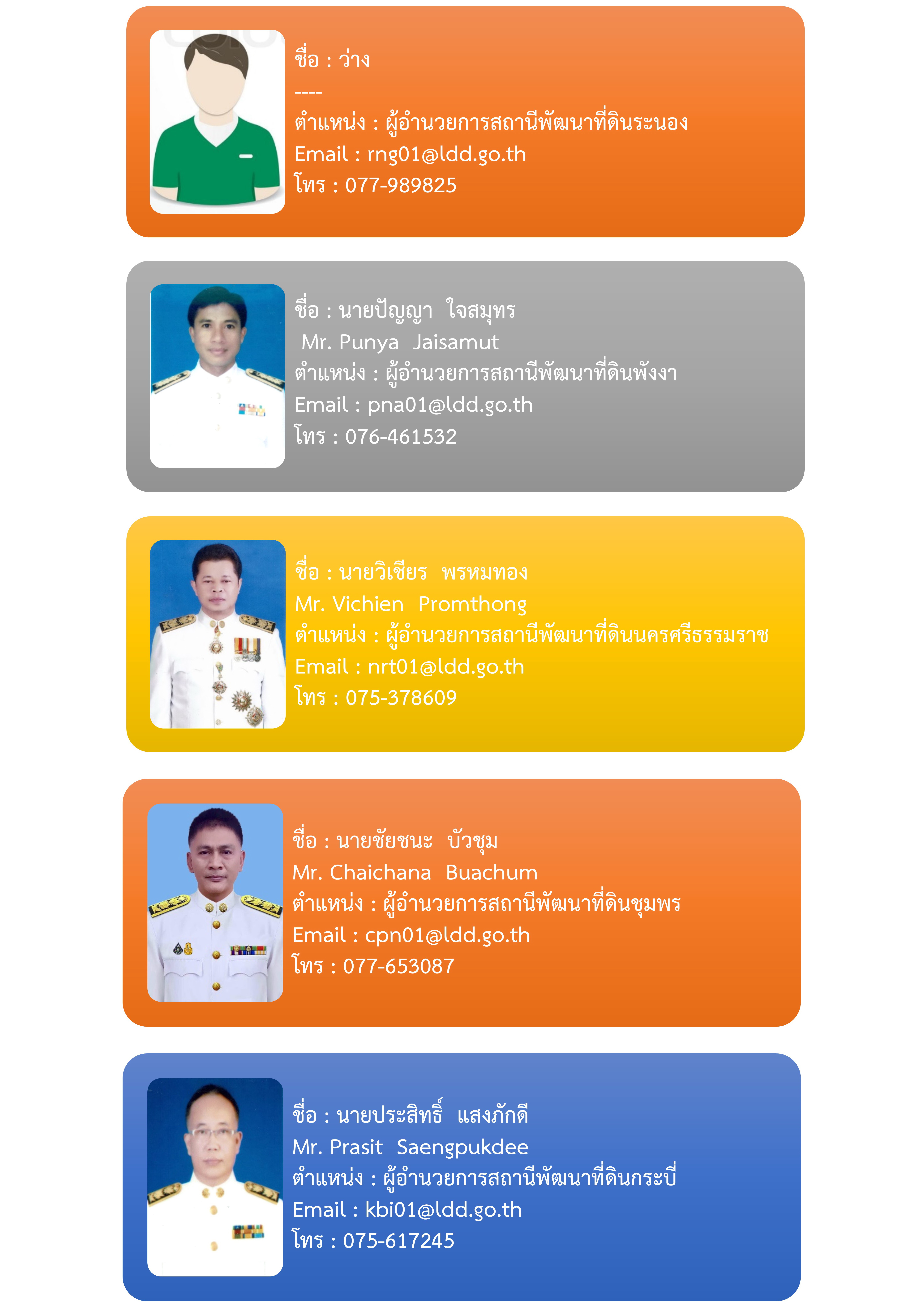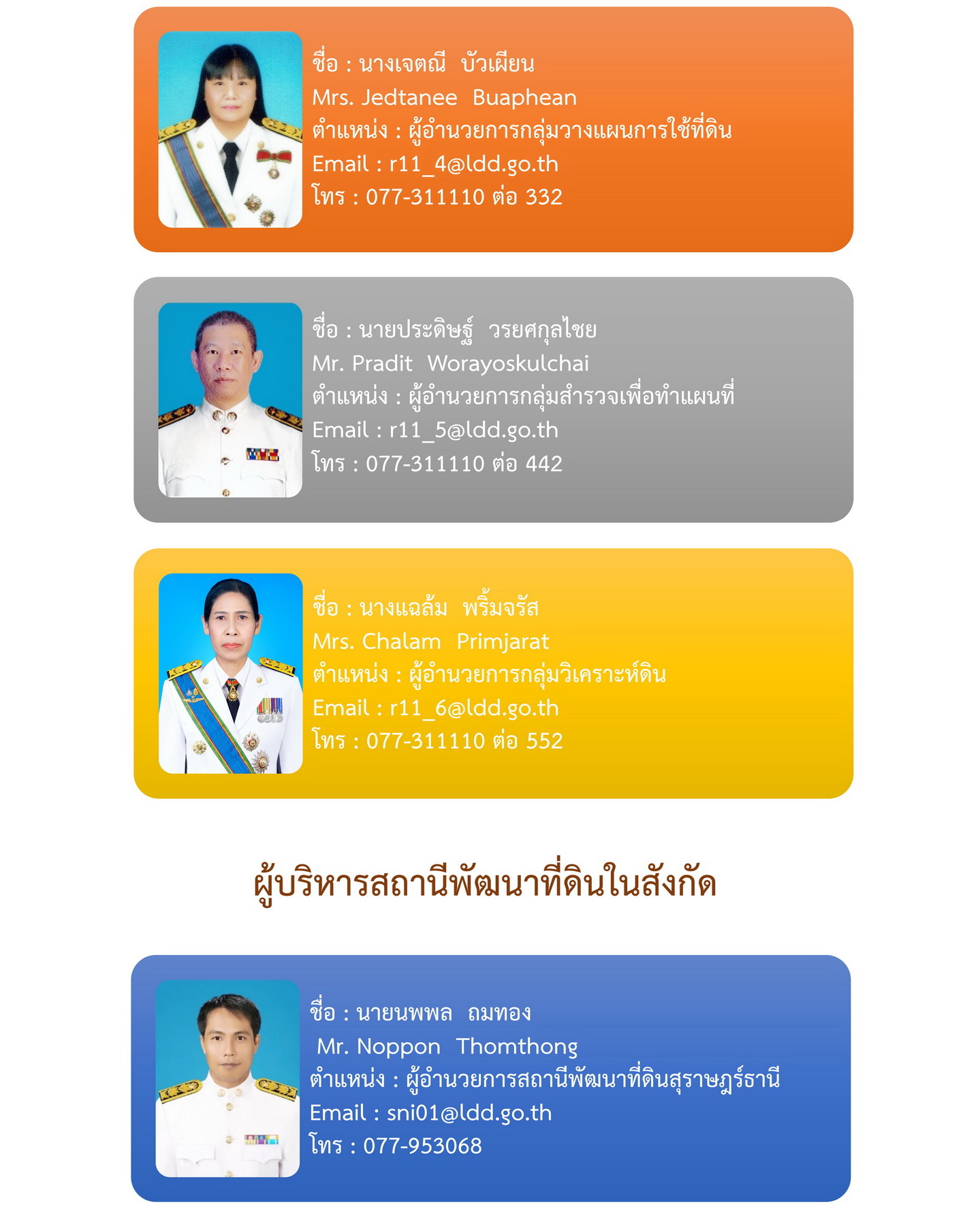 เลขที่ 3 ซ.ธราธิบดี 7 ถ.ธราธิบดี ต.ท่าข้าม อ.พุนพิน จ.สุราษฎร์ธานี โทรศัพท์ 0-7731-1110 โทรสาร 0-7731-2732 E-mail : r11_1@ldd.go.th