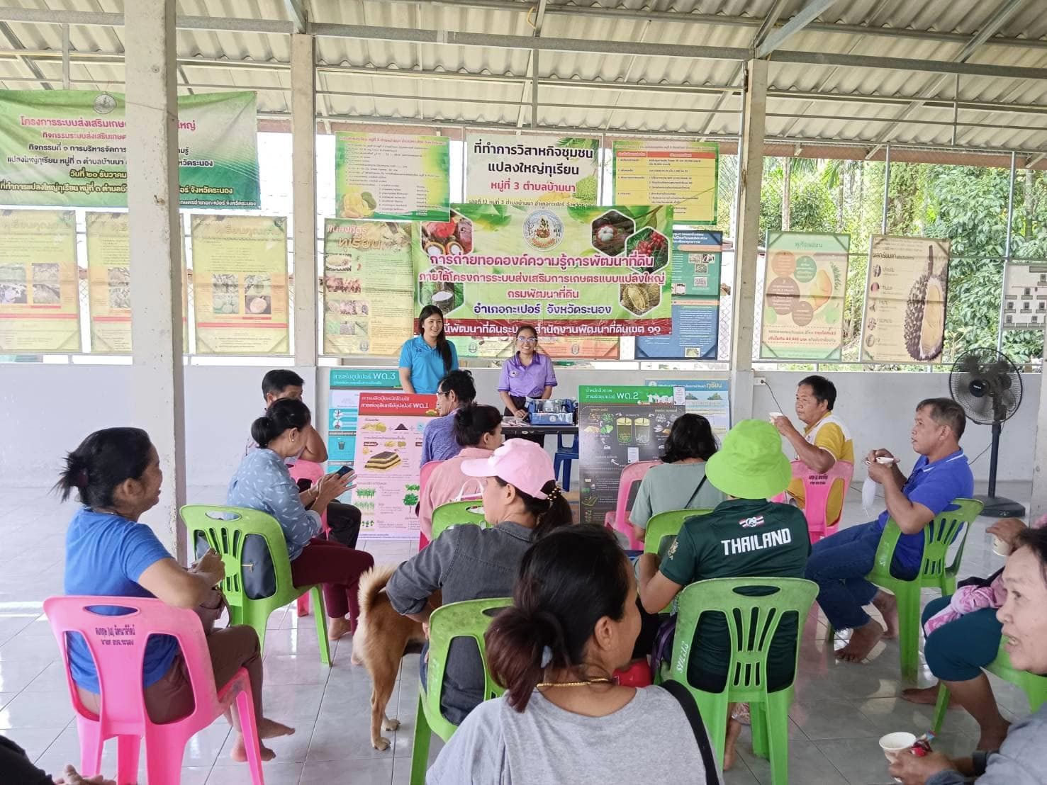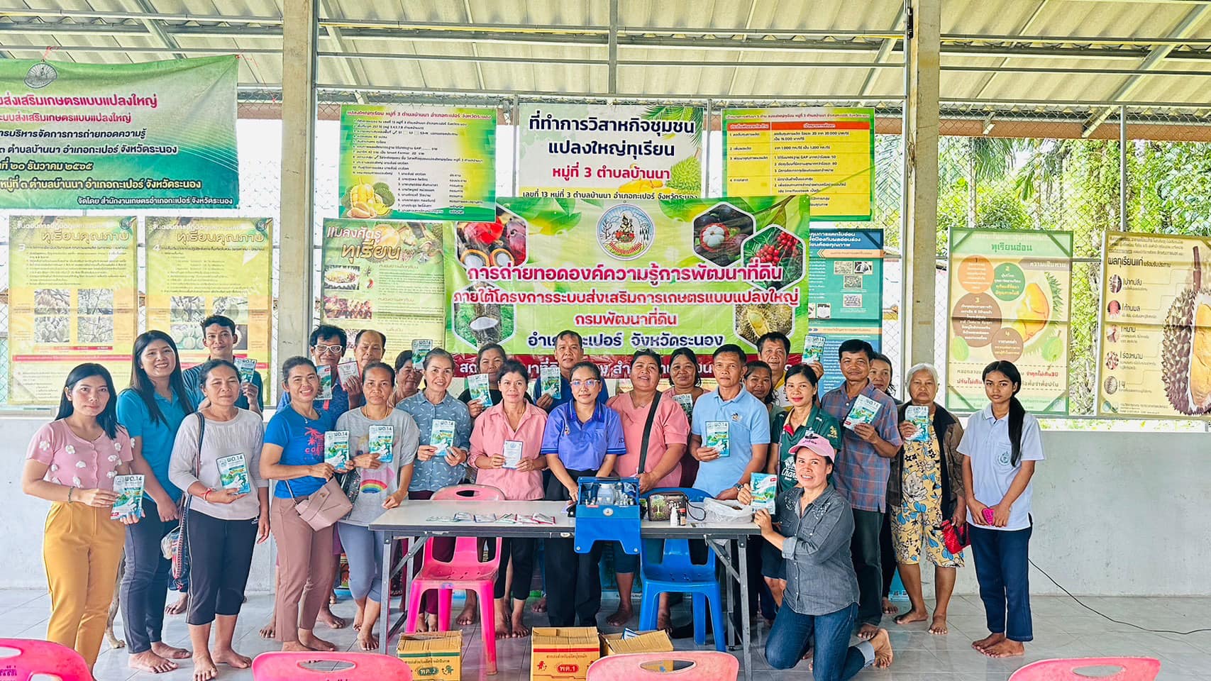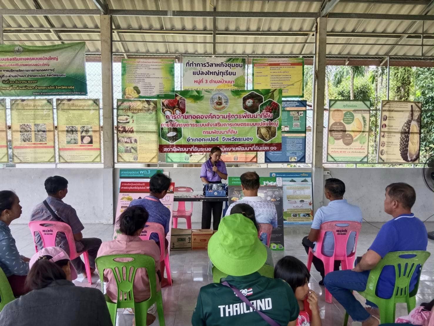 วันพุธ ที่ 20 กันยายน 2566 นางสาววชิราพร ดิษฐ์ราชา นักวิชาการเกษตรปฏิบัติการ พร้อมนาวสาววรพรรณ โกมล นักวิชาการเกษตร และเจ้าหน้าที่สถานีพัฒนาที่ดินระนอง จัดอบรมการถ่ายทอดองค์ความรู้การพัฒนาที่ดิน ภายใต้โครงการระบบส่งเสริมเกษตรแบบแปลงใหญ่ กรมพัฒนาที่ดิน ประจำปีงบประมาณ 2566 เพื่อให้เกษตรกรที่เข้าร่วมฯ มีความรู้ความเข้าใจด้านการพัฒนาที่ดิน การเก็บตัวอย่างดิน การพัฒนาคุณภาพดินในพื้นที่แปลงเกษตรกรให้มีศักยภาพ มีความเหมาะสมในการผลิตพืช และใช้ประโยชน์ที่ดินได้อย่างยั่งยืน ณ ที่ทำการวิสาหกิจชุมชนแปลงใหญ่ทุเรียน หมู่ที่ 3 ตำบลบ้านนา อำเภอกะเปอร์ จังหวัดระนอง