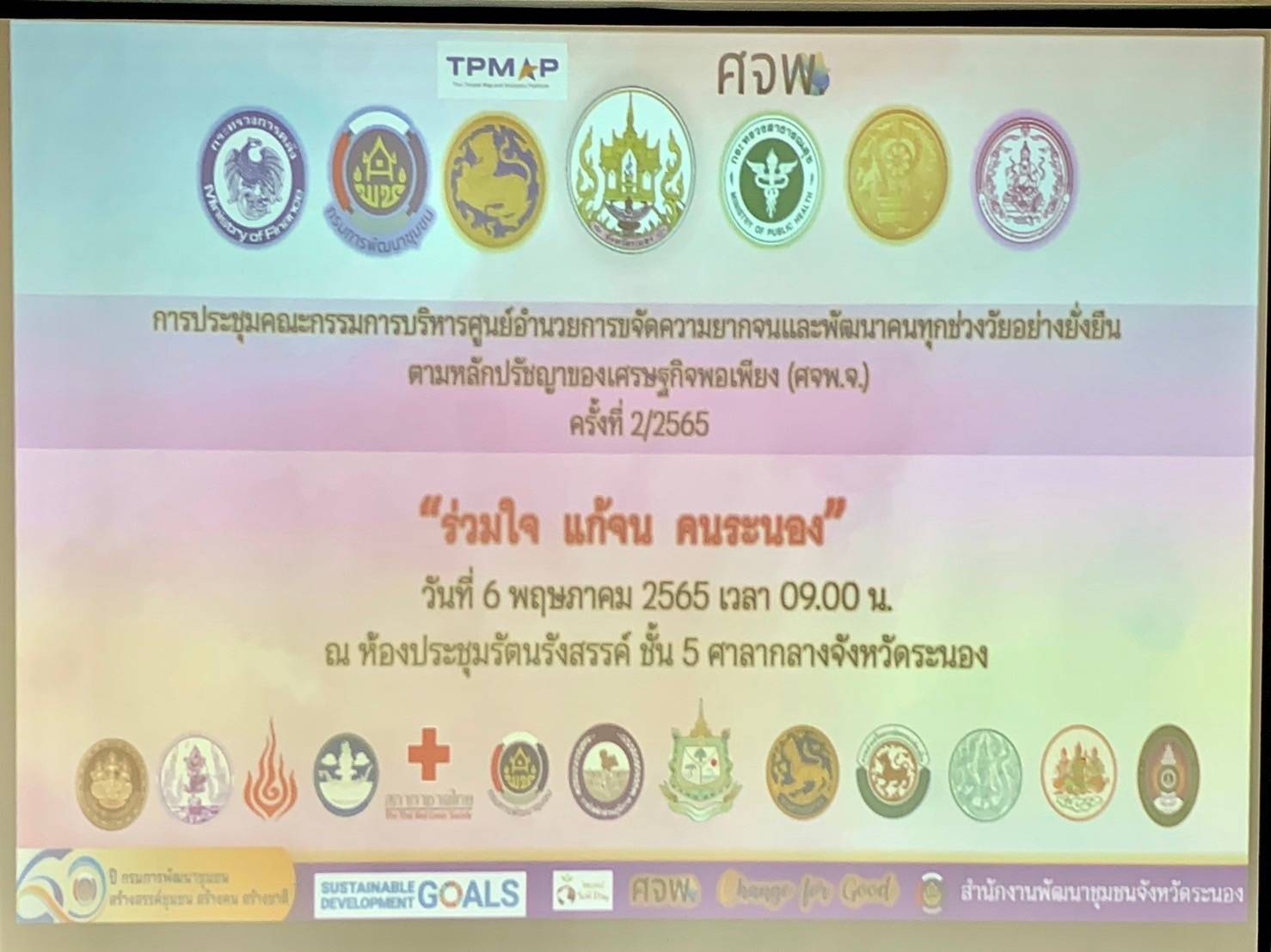 วันศุกร์ที่ 6 พฤษภาคม 2565 นายอัมพร พวงพวา ผู้อำนวยการสถานีพัฒนาที่ดินระนอง เข้าร่วมประชุมคณะกรรมการบริหารศูนย์อำนวยการขจัดความยากจนและพัฒนาคุนทุกช่วงวัยอย่างยั่งยืน ตามหลักปรัชญาของเศรษฐกิจพอเพียงจังหวัดระนอง (ศจพ.จ.) “ร่วมใจ แก้จน คนระนอง” ครั้งที่ 2/2565 โดยมีนายปิยพงศ์ ชูวงศ์ รองผู้ว่าราชการจังหวัดระนอง เป็นประธาน และมีนายปลื้ม นับถือบุญ พัฒนาการจังหวัดระนอง หัวหน้าส่วนราชการ พร้อมภาคีเครือข่ายที่เกี่ยวข้องเข้าร่วมประชุม เพื่อพิจารณาหาแนวทางการแก้ไขปัญหา รายตัวชี้วัด และแผนการขับเคลื่อนการขจัดความยากจนและพัฒนาคนทุกช่วงวัยอย่างยั่งยืน ตามหลักปรัชญาของเศรษฐกิจพอเพียง ประจำปี 2565 และการขับเคลื่อนการแก้จน โดยเฉพาะเรื่องกรอบระยะเวลาในการขับเคลื่อนงาน เพื่อให้คณะทำงานในทุกมิติ ได้ประสานและวางแผนบูรณาการให้ความช่วยเหลือครัวเรือนเป้าหมาย โดยเน้นย้ำให้คำนึงถึงประโยชน์ของพี่น้องประชาชนเป็นที่ตั้ง เน้นการลงพื้นที่ครัวเรือนเป้าหมาย และถอดบทเรียนการให้ความช่วยเหลือ ที่จะทำให้ประชาชนชาวระนอง พ้นความยากจนภายใน 30 กันยายน นี้  ณ ห้องประชุมรัตนรังสรรค์ ชั้น 5 ศาลากลางจังหวัดระนอง