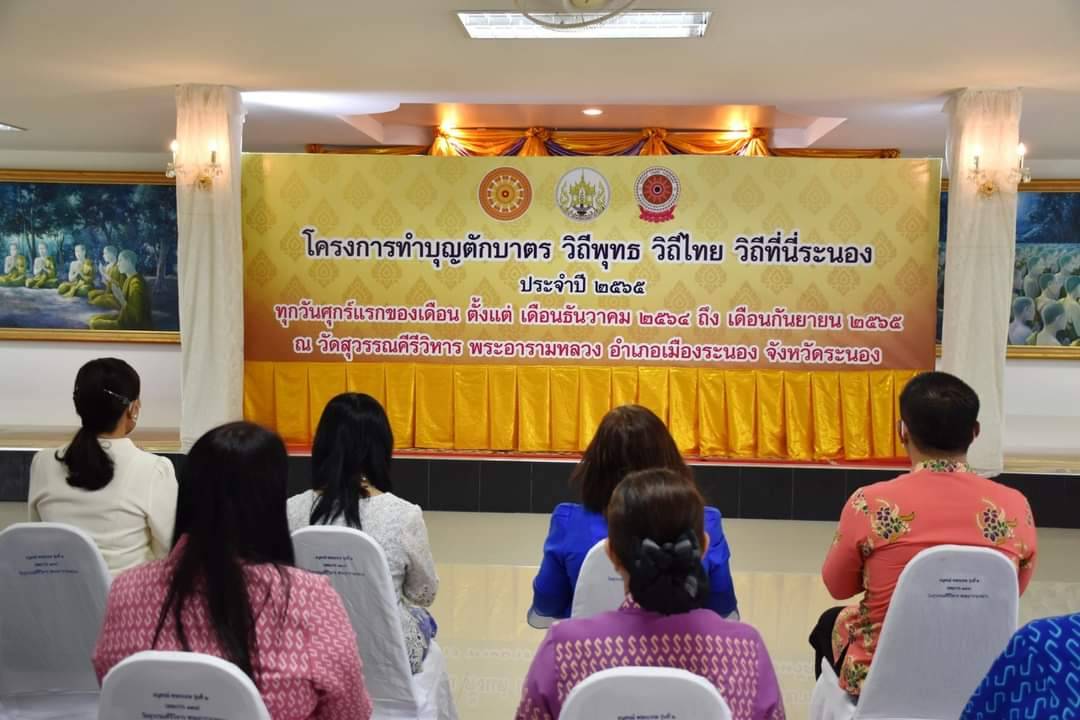 วันศุกร์ที่ 10 มิถุนายน 65 นายอัมพร พวงพวา ผู้อำนวยสถานีพัฒนาที่ดินระนอง พร้อมด้วยนายรณยุทธ สมบึงกลาง นักวิชาการเกษตรปฏิบัติการ ร่วมพิธีทำบุญตักบาตร ตามโครงการทำบุญตักบาตร วิถีพุทธ วิถีไทย วิถีที่นี่ระนอง ประจำปี 2565 โดยมีนายสมเกียรติ ศรีษะเนตร ผู้ว่าราชการจังหวัดระนอง นายปิยพงศ์ ชูวงศ์  นายนพสิทธิ์ อุดมสุวรรณกุล รองผู้ว่าราชการจังหวัดระนอง นายบุญชัย สมใจ ปลัดจังหวัดระนอง พร้อมด้วยหัวหน้าส่วนราชการ และพุทธศาสนิกชนร่วมพิธี เพื่ออนุรักษ์และสืบทอดขนบธรรมเนียมประเพณีและปลูกฝังค่านิยมที่ดีงามให้อยู่คู่กับ วิถีพุทธ วิถีไทย วิถีที่นี่ระนอง เสริมสร้างการมีส่วนร่วมบูรณาการ บ้าน วัด โรงเรียน ส่วนราชการ ในการพัฒนาวัดให้เป็นศูนย์กลางของชุมชน และเพื่อส่งเสริมให้ข้าราชการ เยาวชน นักเรียน นักศึกษา พุทธศาสนิกชน ร่วมเข้าวัดทำบุญ ฟังธรรม และหลักธรรมทางพระพุทธศาสนามาใช้ในการดำเนินชีวิต ณ วัดสุวรรณคีรีวิหาร พระอารามหลวง อำเภอเมือง จังหวัดระนอง