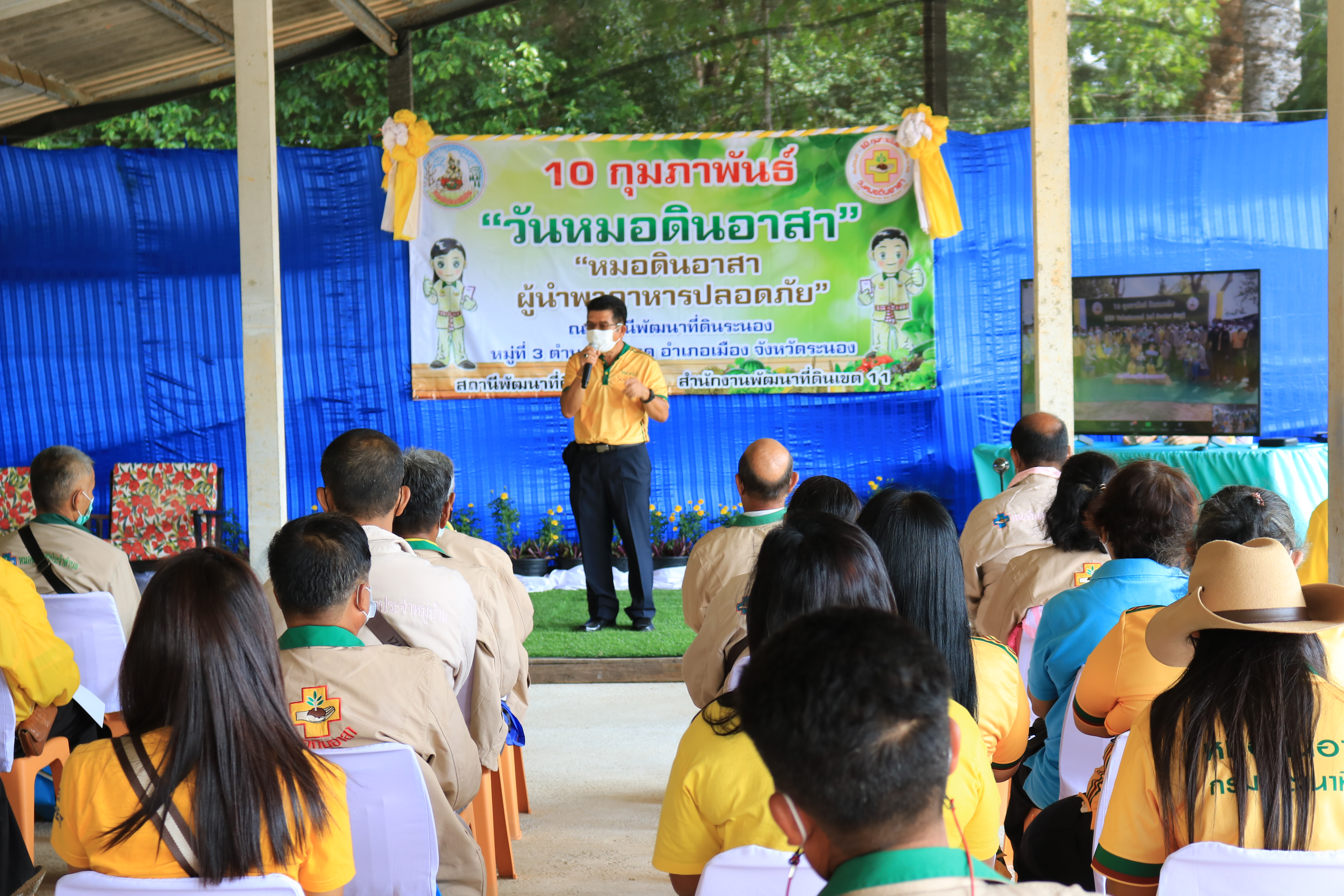 วันที่ 10 กุมภาพันธ์ 2565 นายอัมพร พวงพวา ผู้อำนวยการสถานีพัฒนาที่ดินระนอง พร้อมด้วยข้าราชการ ลูกจ้างประจำ พนักงานราชการ และเจ้าหน้าที่สถานีพัฒนาที่ดินระนอง ร่วมจัดงานวันหมอดินอาสาในธีมงานวันหมอดินอาสา ประจำปี 2565 “หมอดินอาสา ผู้นำพาอาหารปลอดภัย” พร้อมทั้งจัดอบรมหมอดินอาสา 4.0 ปีงบประมาณ 2565 รุ่นที่ 2 หลักสูตรที่ 3 พัฒนาถังความรู้หมอดินอาสารูปแบบดิจิทัล โดยมีวัตถุประสงค์ เพื่อเป็นการเชิดชูเกียรติแก่หมอดินอาสาของสถานีพัฒนาที่ดินระนองที่ได้สร้างคุณประโยชน์ต่อสาธารณชนมาอย่างยาวนาน เพื่อจัดให้มีวันจัดกิจกรรมเชื่อมสัมพันธ์ระหว่างหมอดินอาสาและเจ้าหน้าที่สถานีพัฒนาที่ดิน เพื่อได้ยกระดับการสร้างขวัญกำลังใจ และแนวทางในการช่วยเหลือและดูแลกันและกันของหมอดินอาสา รวมทั้งการสร้างความเข้มแข็งให้กับเครือข่ายหมอดินอาสา ณ สถานีพัฒนาที่ดินระนอง หมู่ที่ 3 ตำบลราชกรูด อำเภอเมือง จังหวัดระนอง