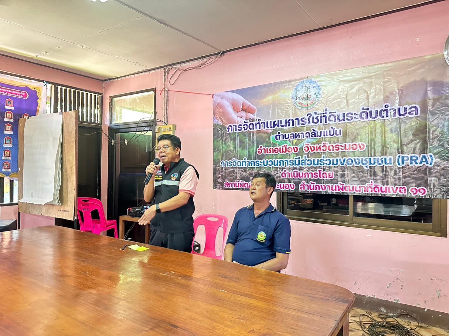 วันอังคารที่ 4 กรกฎาคม พ.ศ. 2566 นายอัมพร พวงพวา ผู้อำนวยการสถานีพัฒนาที่ดินระนอง นางพรทิพย์ สวนชำนิ นักวิชาการเกษตรชำนาญการ พร้อมด้วยเจ้าหน้าที่สถานีพัฒนาที่ดินระนอง ร่วมดำเนินการจัดทำแผนการใช้ที่ดินระดับตำบล ผ่านกระบวนการวิเคราะห์ชุมชนแบบมีส่วนร่วม (Participatory Rural Appraisa : PRA) โดยมีนายกองค์การบริหารส่วนตำบลหาดส้มแป้น กำนัน ผู้ใหญ่บ้าน หมอดินอาสา และเกษตรกร เข้าร่วมวางแผนเกี่ยวกับสภาพการใช้ที่ดินของตำบล ความเหมาะสมของพื้นที่ เพื่อให้ชุมชนสะท้อนปัญหารับฟังความคิดเห็น ข้อเสนอแนะและความต้องการของชุมชน เพื่อรวบรวมประเด็นข้อมูลต่างๆ นำมาจัดทำแผนการใช้ที่ดินระดับตำบล ณ ศาลาอเนกประสงค์ประจำหมู่บ้าน หมู่ที่ 2 ตำบลหาดสัมแป้น อำเภอเมือง จังหวัดระนอง