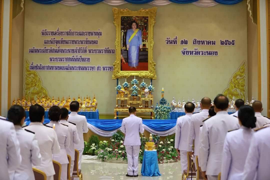 วันที่ 12 สิงหาคม 2565 เวลา 18.00 น. นายรณยุทธ สมบึงกลาง นักวิชาการเกษตรปฏิบัติการ และนายนพดล อุบลเลิศ เจ้าพนักงานการเกษตรปฏิบัติงาน สถานีพัฒนาที่ดินระนอง เข้าร่วมพิธีถวายเครื่องราชสักการะและวางพานพุ่ม และพิธีจุดเทียนถวายพระพรชัยมงคล เนื่องในโอกาสมหามงคลเฉลิมพระชนมพรรษา 90 พรรษา 12 สิงหาคม 2565 สมเด็จพระนางเจ้าสิริกิติ์ พระบรมราชินีนาถ พระบรมราชชนนีพันปีหลวง โดยมีนายสมเกียรติ ศรีษะเนตร ผู้ว่าราชการจังหวัดระนอง เป็นประธาน และมีเหล่าข้าราชการพลเรือน ตุลาการ ศ่าล ทหาร ตำรวจ พนักงานรัฐวิสาหกิจ พ่อค้า ประชาชน กลุ่มพลังมวลชนทุกหมู่เหล่าร่วมพิธีจำนวนมากเข้าร่วม ณ หอประชุมจังหวัดระนอง ศูนย์ราชการจังหวัดระนอง