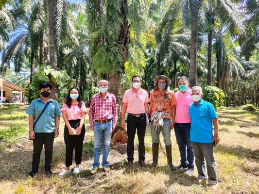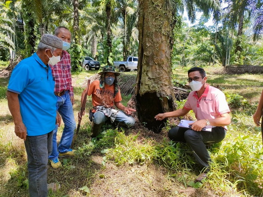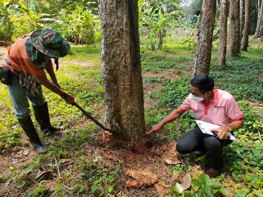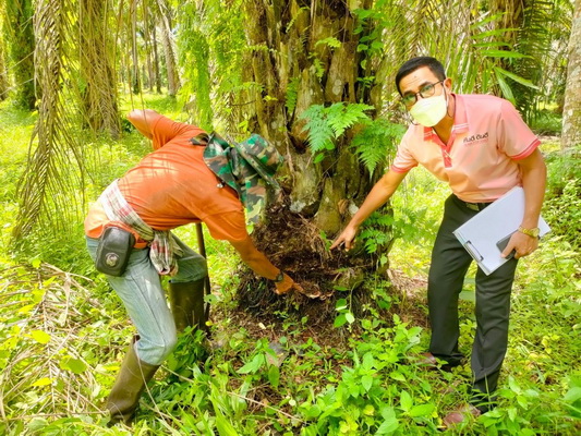 วันที่ 9 มิถุนายน 2565 นายจำเริญ นาคคง ผู้อำนวยการสถานีพัฒนาที่ดินสุราษฎร์ธานี พร้อมด้วยนางสาวปิยวรรณ พุ่มพวง นักวิชาการเกษตรปฏิบัติการ นายชัยยศ สุภาเสและนางสาวอมราภรณ์ แก้วคง ฝ่ายวิชาการเพื่อการพัฒนาที่ดินที่ 4 สถานีพัฒนาที่ดินสุราษฎร์ธานี ลงพื้นที่ติดตามเยี่ยมเยียนแปลงเกษตรกรปลูกยางพารา ที่ประสบปัญหาต้นยางพาราเป็นโรครากขาว ซึ่งมีสาเหตุจากเชื้อราชั้นสูงจำพวกเห็ด สร้างความเสียหาย โดยเข้าไปทำลายระบบรากทำให้ต้นยางที่เป็นโรคจะยืนต้นตาย และสวนปาล์มน้ำมันที่เป็นโรคกาโนเดอร์มา เป็นดอกเห็ดคล้ายเห็ดหลินจือ การพบดอกเห็ดบนต้นปาล์มนั้นแสดงว่าเส้นใยของเชื้อราได้เข้าไปทำลายเซลล์ในลำต้นปาล์มน้ำมันได้เป็นจำนวนมากแล้ว มักจะทำให้ต้นปาล์มน้ำมันยืนต้นตายได้ภายใน 2-3 ปี ทั้งนี้มีการให้คำแนะนำแก่เกษตรกร ทดลองใช้สารเร่ง พด.14 ซึ่งเป็นผลิตภัณฑ์ตัวใหม่ของกรมพัฒนาที่ดิน และได้อธิบายถึงคุณสมบัติ วิธีการใช้เพื่อการรักษาโรคดังกล่าว ณ แปลงเกษตรกรตำบลประสงค์ อำเภอท่าชนะ จังหวัดสุราษฎร์ธานี